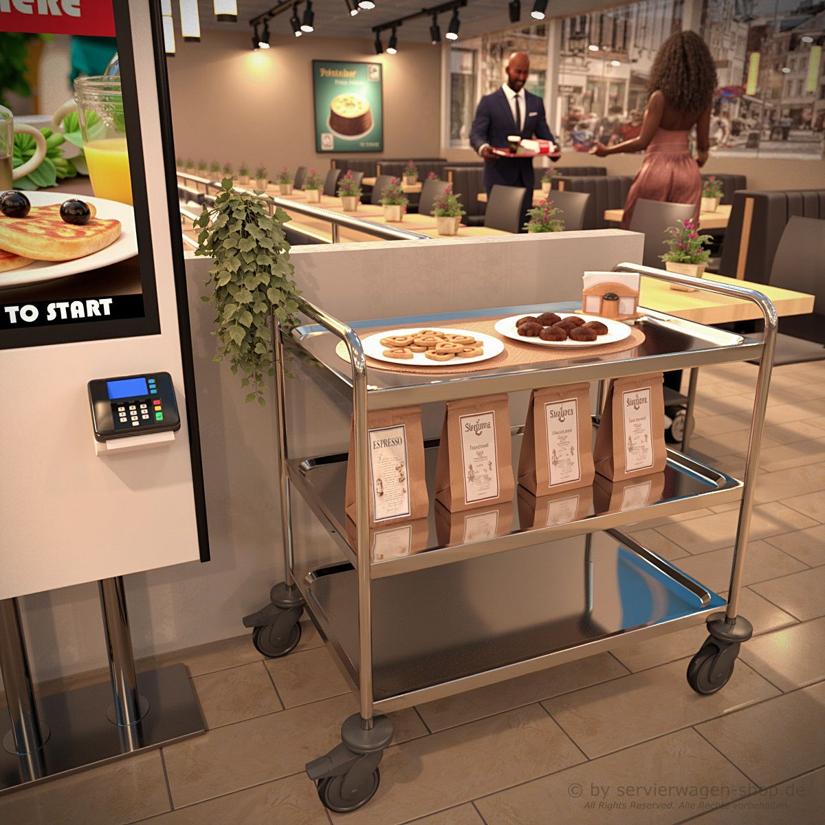 Der Servierwagen ist komplett aus Edelstahl, CNS 18/10 gefertigt. Die Borde sind fest eingeschweißt, haben einen ringsumlaufenden Profilrand und sind schalldämmend unterfüttert. Die Rollierung als unterer Abschluß der Borde schließt jegliche Verletzungsmöglichkeit aus. Fahrbar mittels 4 korrosionsgeschützen Lenkrollen, 2 davon sind anbremsbar. Es handelt sich bei dieser Serie nicht um eine instabile Schraubkonstruktion, sondern um die solide und festverschweißte Ausführung des Hersteller: BLANCO ®.